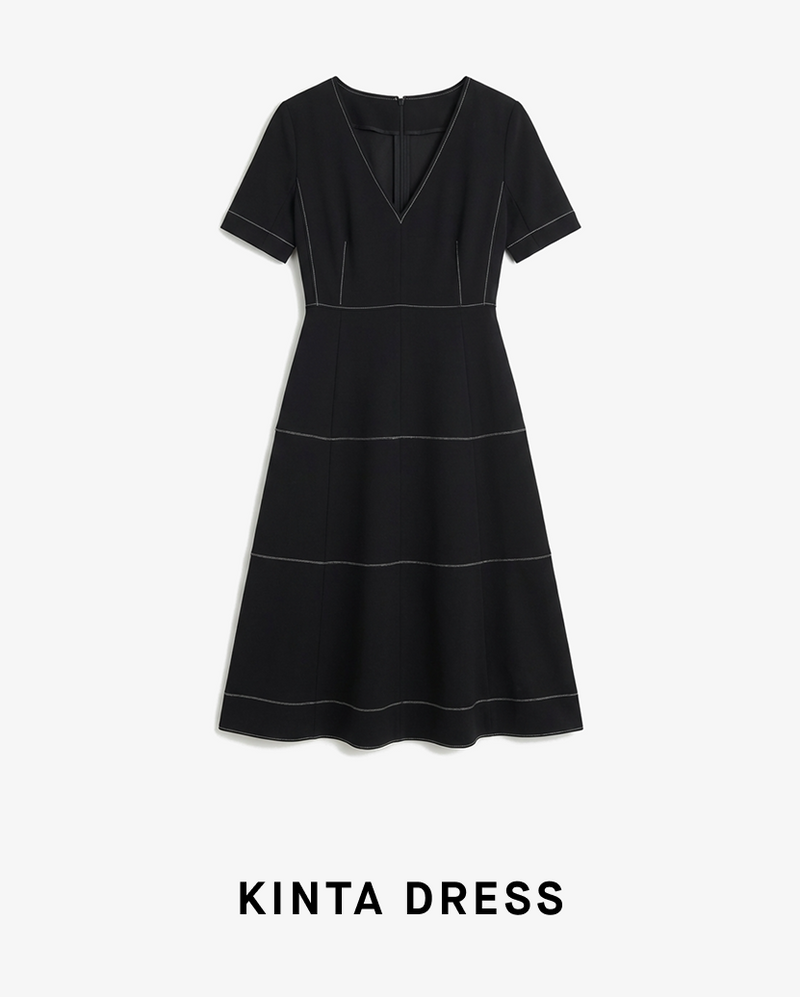 • Woman in a black dress standing on a rocky beach with 'Dresses' text overlay.