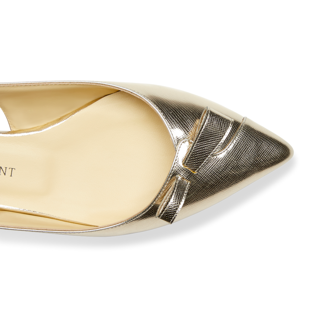 A sling-back ballet flat in Gold Saffiano, complete with comfortable 360 padding and topped with an asymmetrical bow.