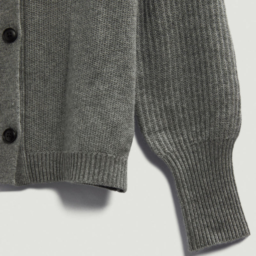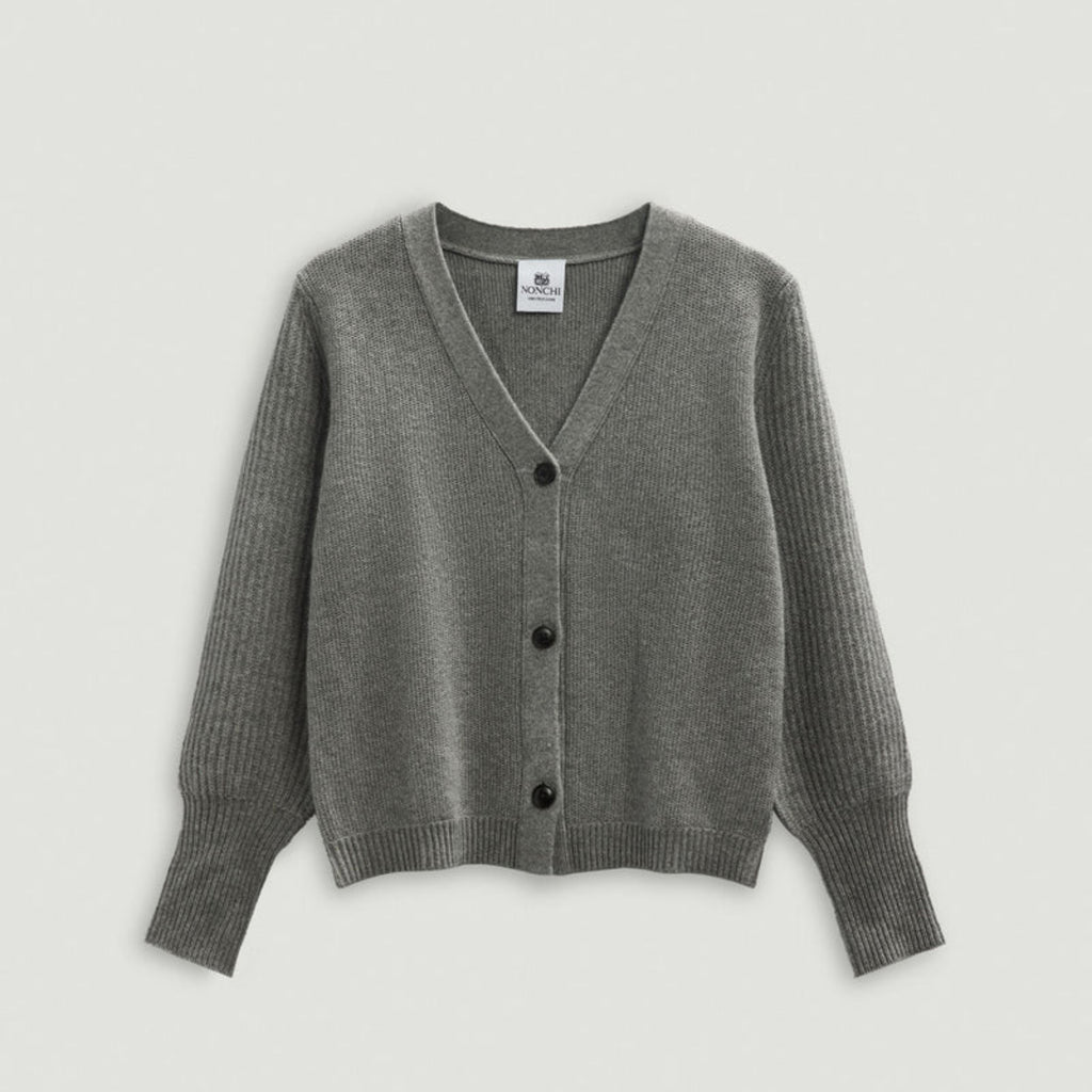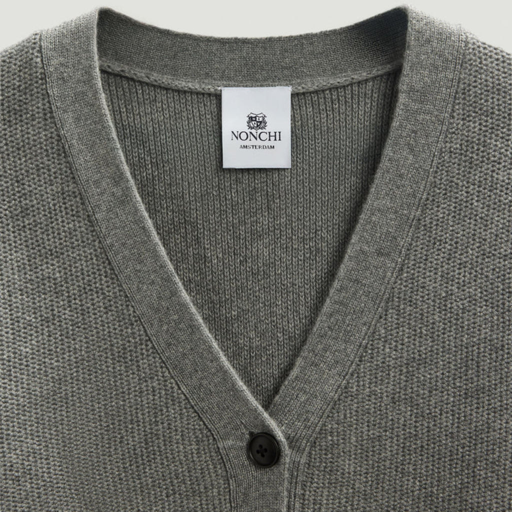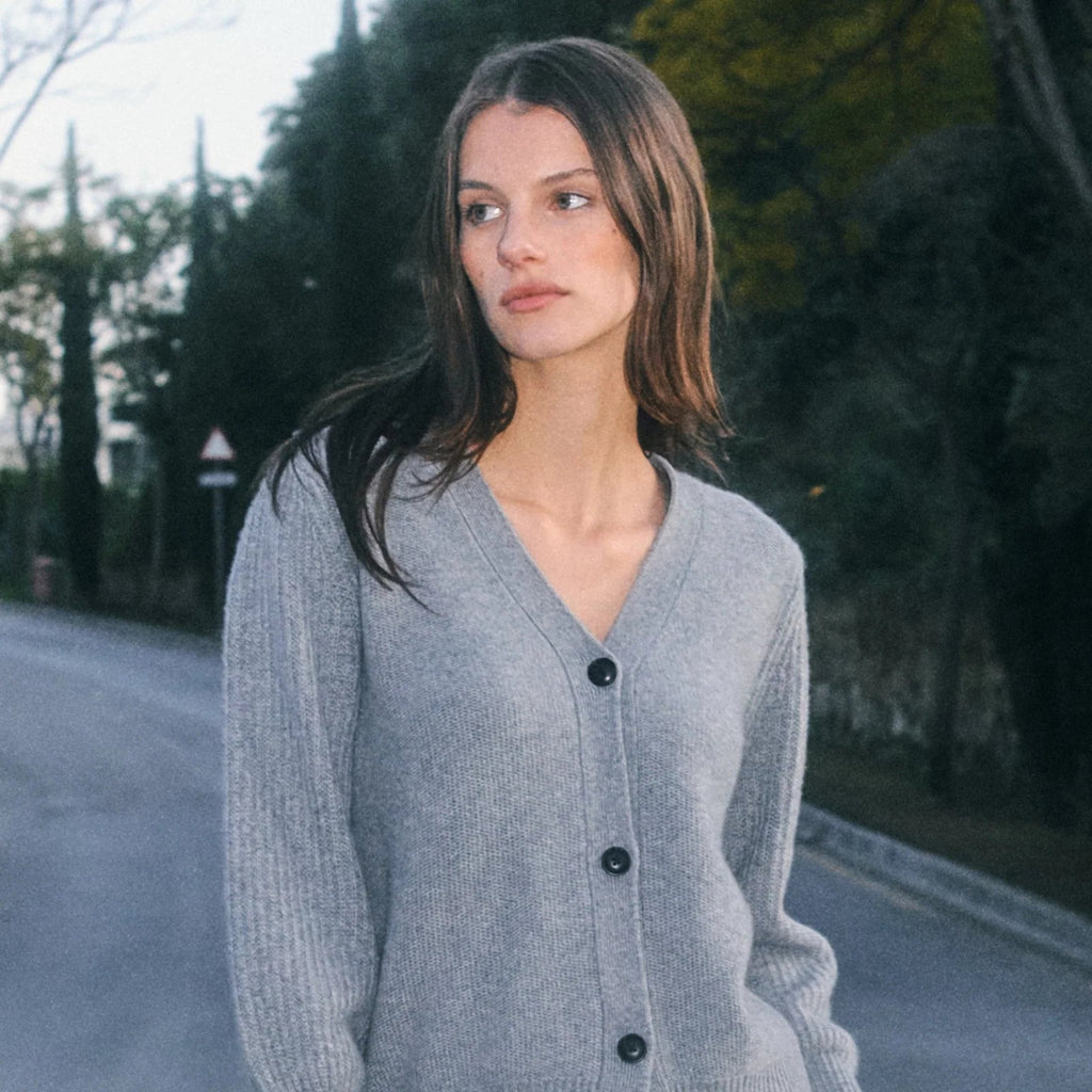 The Resort Cardigan in soft grey envelops the body in gentle structure, providing warmth that feels weightless. Ribbed cuffs and a deep neckline frame the form with ease and intention. The serene grey tone recalls mist-laden mornings, timeless and soothing, a garment to return to again and again.
